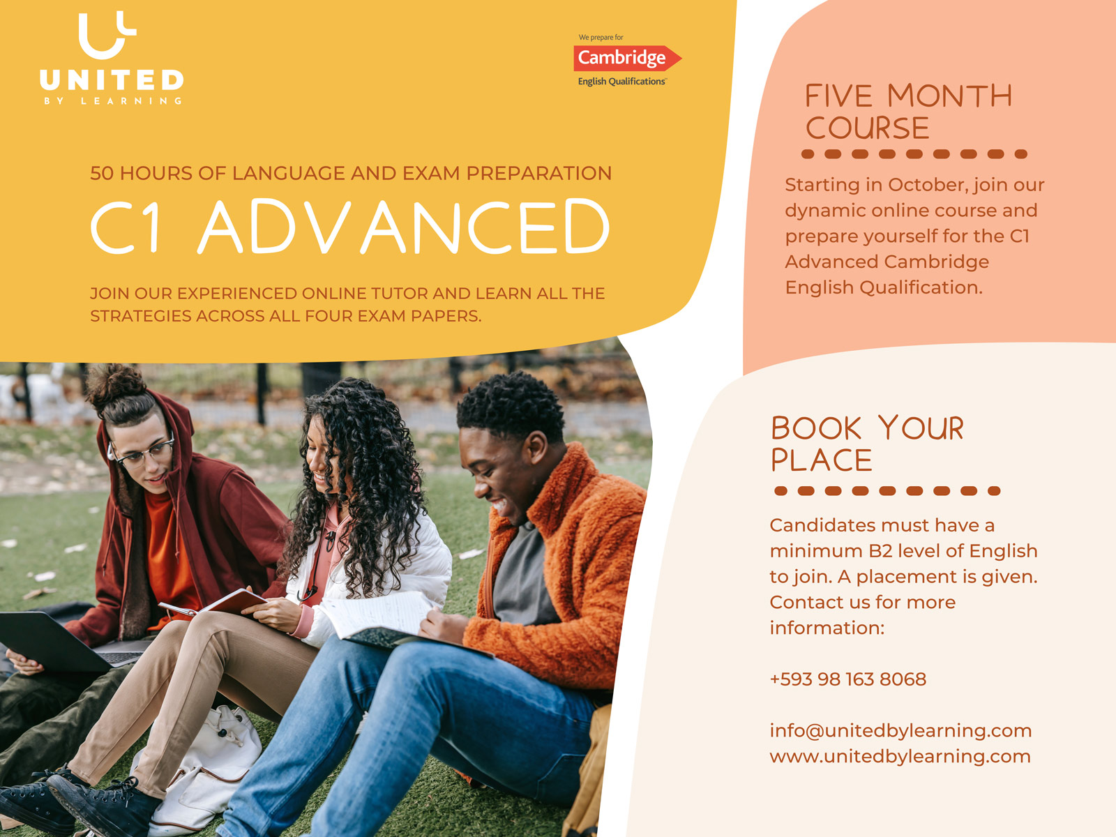 The course begins in October 2021 and ends in February 2022. You will study online with our highly-recommended Cambridge exam tutor for 10 hours a month along with extra practice on a Cambridge platform.