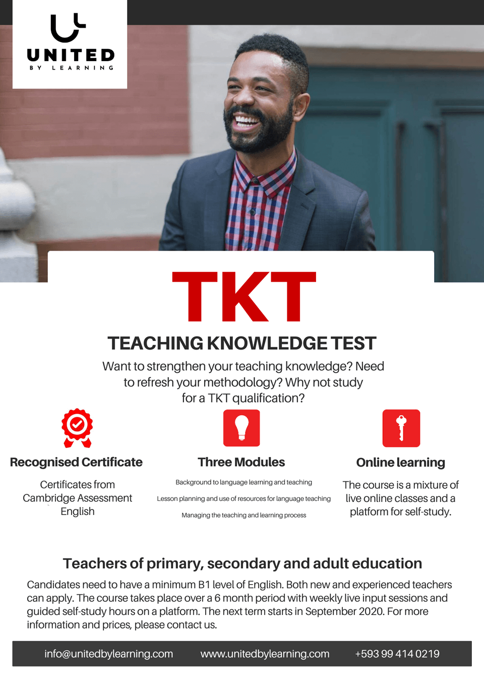 We have our next TKT course starting this September 2020! The Teaching Knowledge Test is a globally recognised qualification from Cambridge Assessment English. Our exciting course is a mixture of live weekly input sessions and a platform for self-study which covers these three core areas: